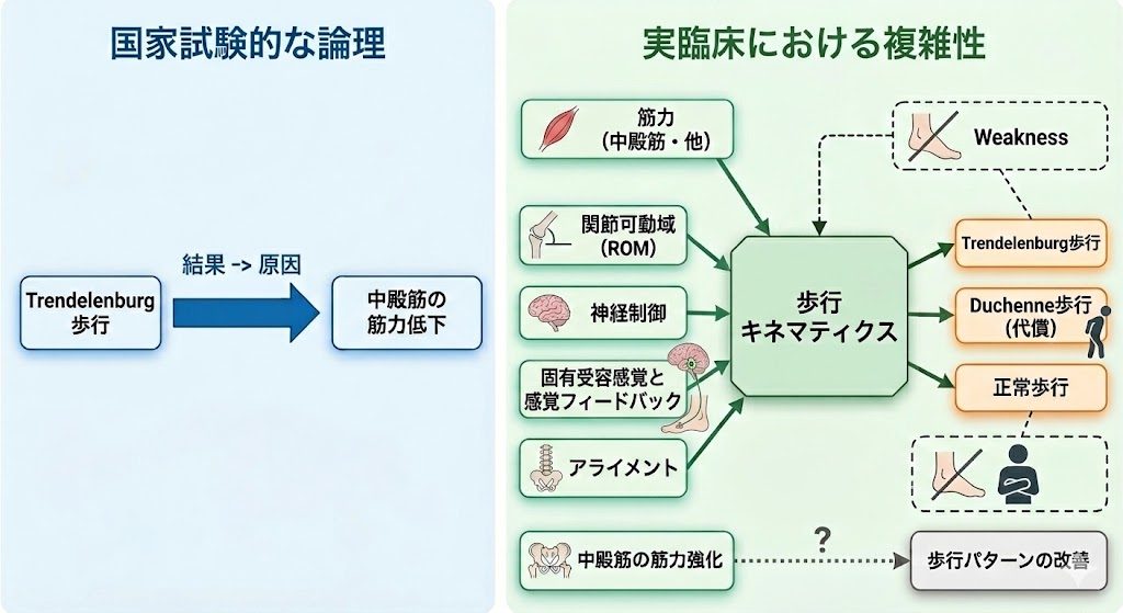 あくまでそれ以外の要素も複雑に絡み合った結果としてTrendelenburg歩行が生じるということであって、筋力低下をその要因から排除する主張ではないということは注意する必要があります。