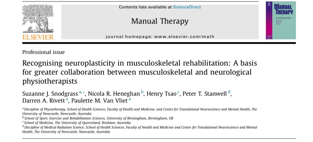 Snodgrass SJ, Heneghan NR, Tsao H, Stanwell PT, Rivett DA, Van Vliet PM. Recognising neuroplasticity in musculoskeletal rehabilitation: a basis for greater collaboration between musculoskeletal and neurological physiotherapists. Man Ther. 2014;19(6):614-617. doi:10.1016/j.math.2014.01.006