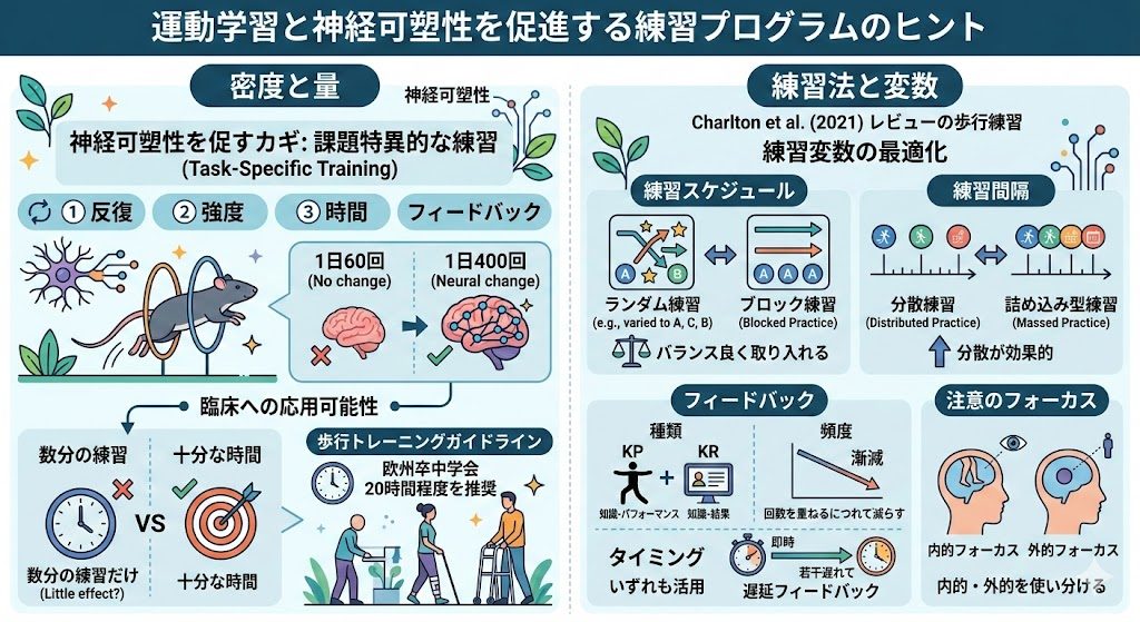 課題特異的な練習(task-specific training)を通じて神経の可塑的変化を促すためには、まず非常に密度の高い練習をする必要があるというのが一般的な理解となっています(Hubbard et al., 2009)。